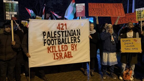 ورفع المتظاهرون لافتات جاء فيها: “أشهروا البطاقة الحمراء لإسرائيل”، مطالبين بمنعها من المشاركة في الأنشطة الرياضية بدعوى ارتكابها «إبادة جماعية ضد الفلسطينيين» في غزة، كما رددوا هتافات تضامنية مع الشعب الفلسطيني بينها: “الحرية لفلسطين”.