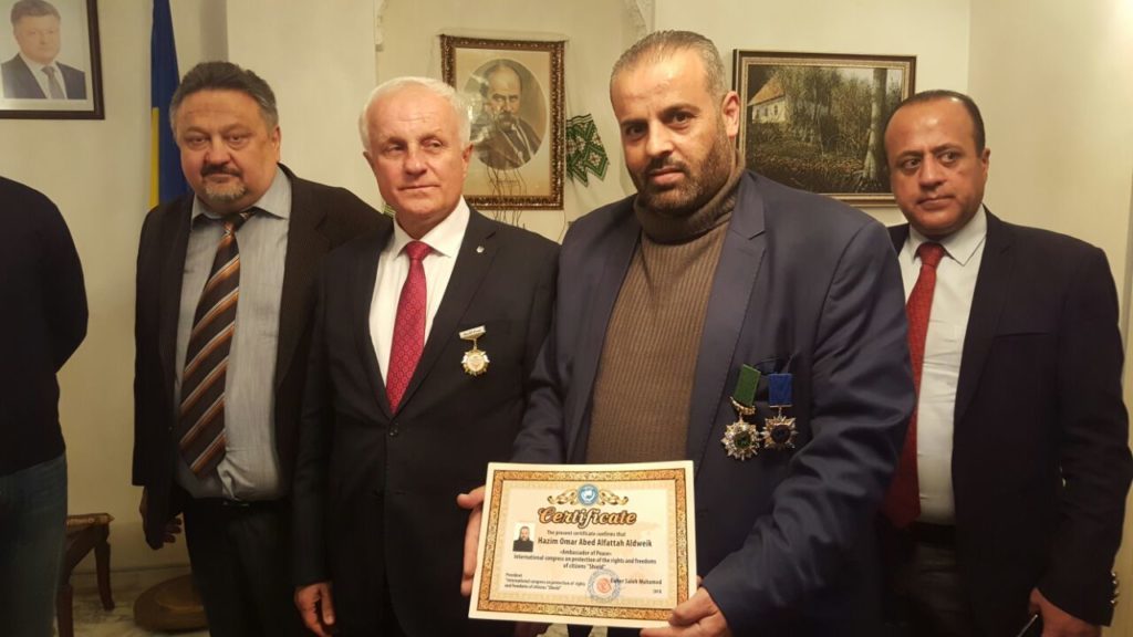 Международный конгресс по защите прав и свобод гражданин «Щит» присвоил почетное звание «Посла мира» гражданину Хазиму Омару Абед Альфаттах Алдвейку, за видающийся вклад в правозащитную деятельность и межнародную интеграцию, плодотворное сотрудничество, професионализм и большой вклад в правовую систему. А также за выдающиеся гуманитарные усилия, направленные на поддержку мира во всем мире на местном и международном уровнях. Награждение прошло в здании посольства Украины в Хашимитском королевстве Иордании города Амман. На вручении присутсвовали: Чрезвычайный Полномочный Посол Украины в Хашимитском Королевстве Иордания — Пасько Сергей Алексеевич, вице – президент Международного конгресса по защите прав и свобод граждан «Щит» — Матякин Александр Георгиевич, представителя Международного конгресса «Щит» на Ближнем Востоке и Северной Африки Саттам Хаким Альфаиз, послы мира, зарубежные и иорданские деятели, а так же украинские общины находящееся в городе Аммане.