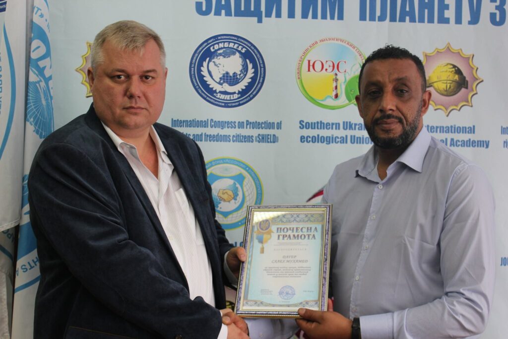 В офисе Международного конгресса по защите прав и свобод граждан «ЩИТ» Директор Департамента культуры, туризма, национальностей и религий Запорожской областной государственной администрации Мороко Владимир Валерьевич вручил почетную грамоту президенту Организации «ЩИТ» профессору Дагеру Салеху Мухамеду за добросовестный плодотворный труд, преданность избранному делу, активную правозащитную деятельность и весомый личный вклад в защиту прав и свобод национальных сообществ