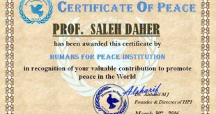 Организация «Человечество за мир» в лице президента М.Д. Альшарифа наградила Президента международной организации «Щит» Салеха Дагера именным Сертификатом Мира. Основатель и Президент Мохд Джамаль Альшариф отметил: «Это большая честь для организации «Человечество за Мир» наградить Президента Международного конгресса по защите прав и свобод граждан «Щит» Профессора Салеха Дагера за неоценимый …