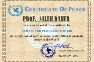 Организация «Человечество за мир» в лице президента М.Д. Альшарифа наградила Президента международной организации «Щит» Салеха Дагера именным Сертификатом Мира. Основатель и Президент Мохд Джамаль Альшариф отметил: «Это большая честь для организации «Человечество за Мир» наградить Президента Международного конгресса по защите прав и свобод граждан «Щит» Профессора Салеха Дагера за неоценимый …